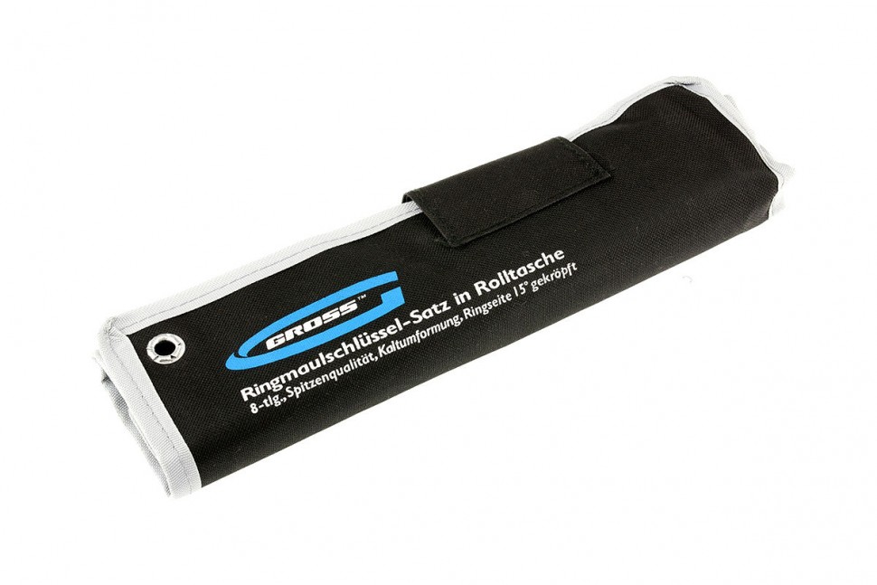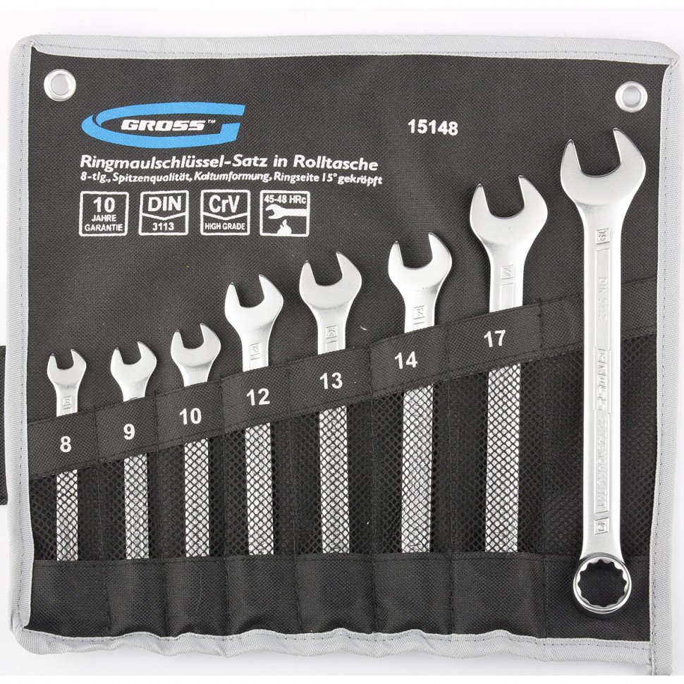 Набор комбинированных ключей торговой марки GROSS предназначен для монтажа/демонтажа резьбовых соединений. Ключи набора изготовлены из высококачественной хромованадиевой (Crv) стали методом холодного штампа.Твердость 45-48 HRC. В набор входит восемь ключей размером от 8 до 19 мм. Каждый ключ с одной стороны оснащен захватом открытого типа — рожковым и накидным (кольцевым) с другой стороны.Профиль кольцевого зева имеет 12 граней, что увеличивает площадь соприкосновения рабочих поверхностей и снижает риск деформации граней крепежа при монтаже. Угол наклона кольцевого зева относительно плоскости ключа в 15 градусов делает монтаж более удобным. Хромоникелевое покрытие ключей улучшает антикоррозийные свойства инструмента.