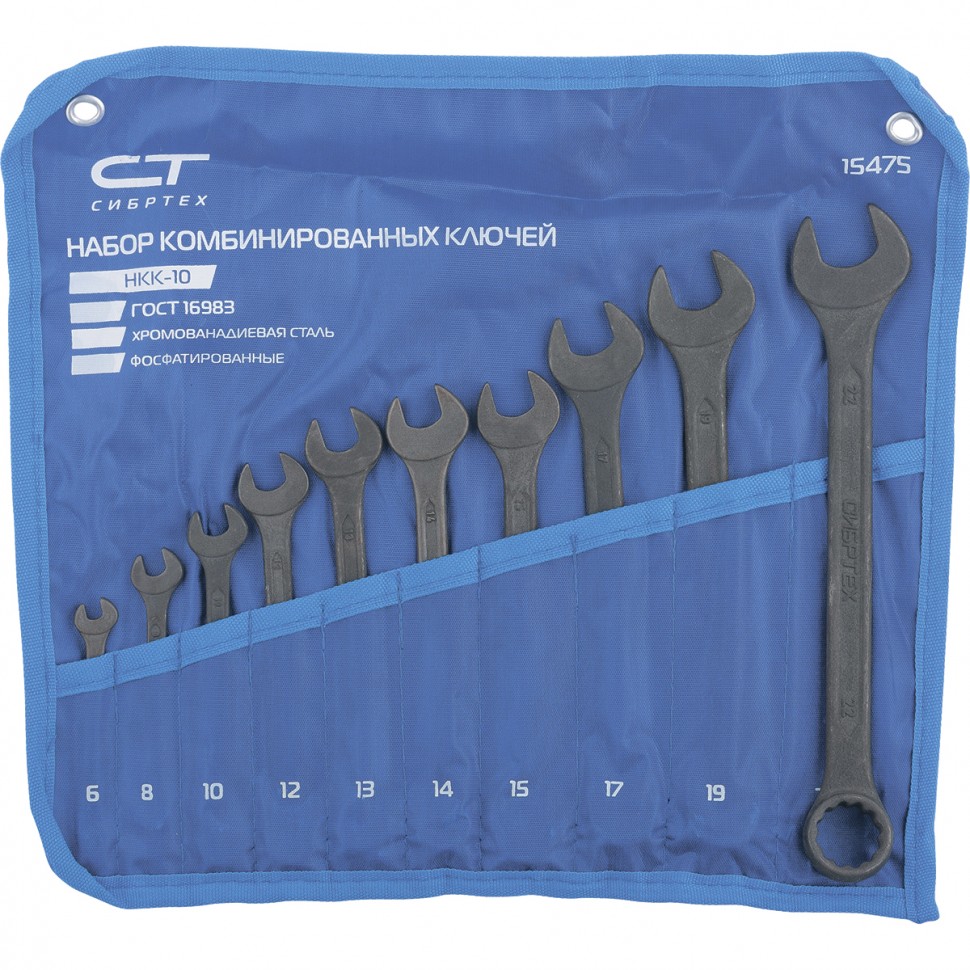 Набор ключей комбинированных, 6 - 22 мм, 10 шт., CrV, фосфатированные, ГОСТ 16983 Сибртех