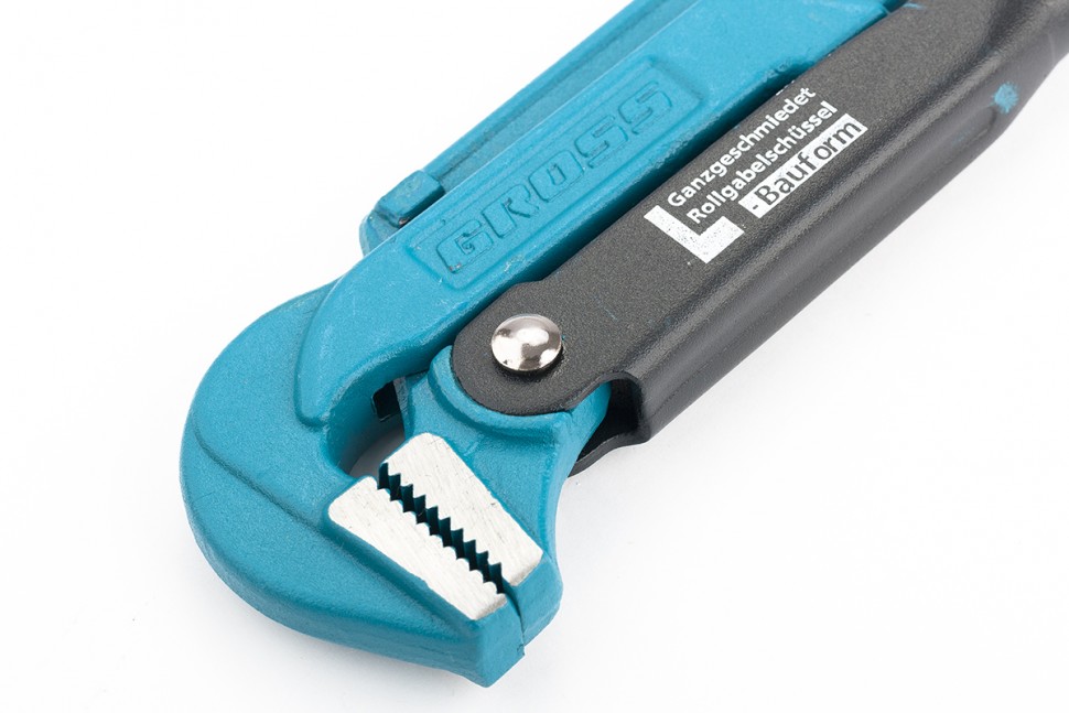 Ключ трубный рычажный типа L усиленной конструкции, применяется при повышенных нагрузках. Предназначен для захватывания и вращения труб и соединительных частей трубопроводов. Изготовлен из высококачественной хромованадиевой стали. Имеет порошковое антикоррозийное покрытие. Губки дополнительно закалены токами высокой частоты до твердости 57–60 HRС. Прогрессивная форма зуба с наклоном против направления вращения обеспечивает самоблокируемый захват деталей. Верхняя ручка имеет выштампованный Т-образный профиль. Регулировочная гайка снабжена стопорным кольцом.
