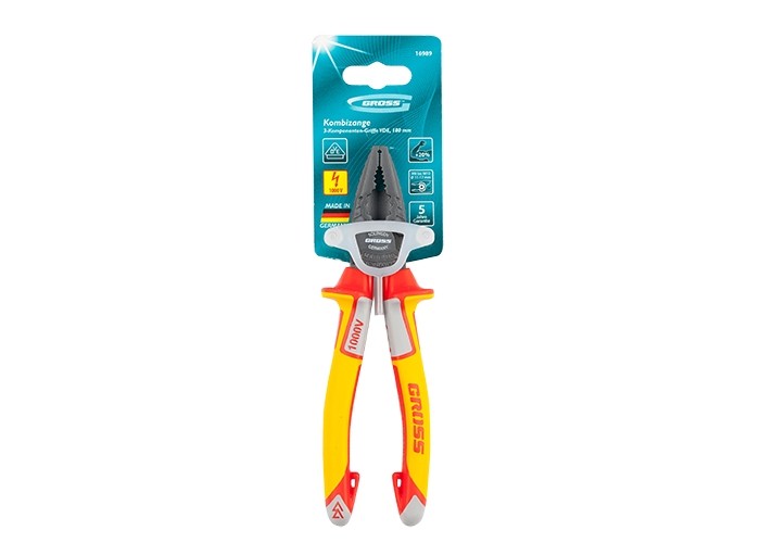 Плоскогубцы комбинированные, диэлектрические трехкомпонентные рукоятки до 1000 В, 180 мм Gross