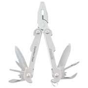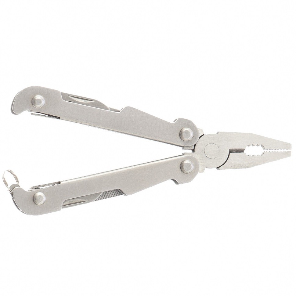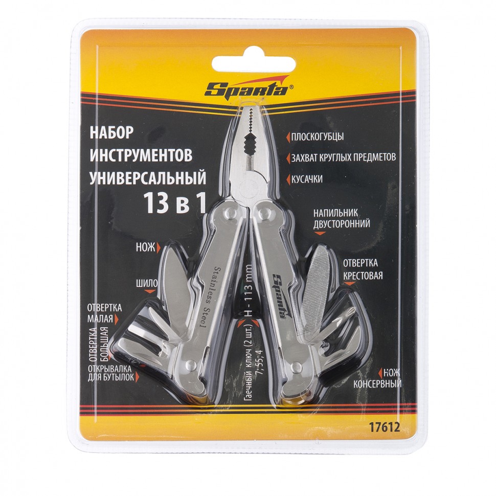 В комплект входят: плоскогубцы, кусачки, захват круглых предметов, крестовая отвертка, консервный нож, открывалка для бутылок, отвертки шлицевые средняя и малая, пилка, шило, напильник, большой нож.