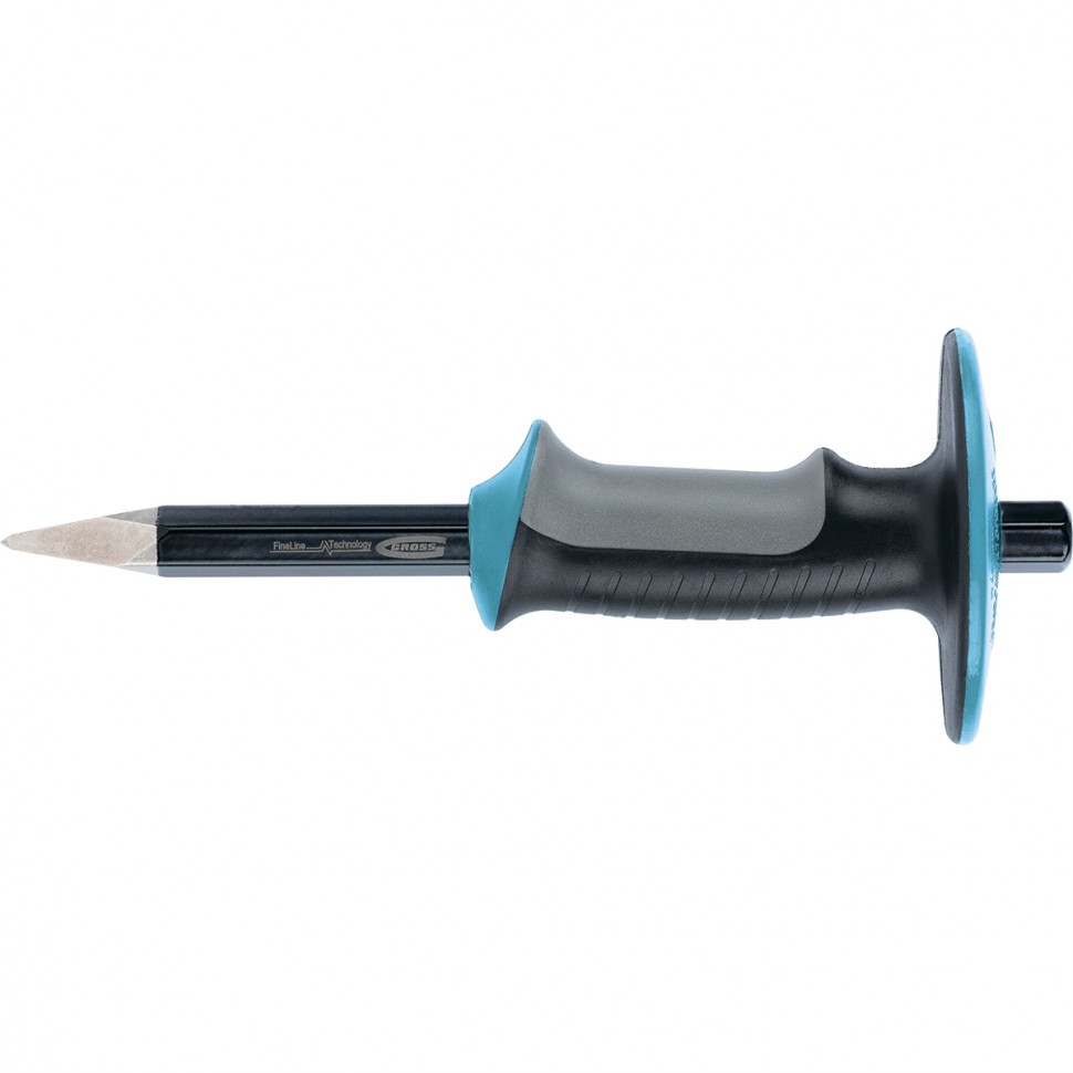 Для обеспечения безопасной работы и защиты рук от случайных попаданий по ним молотком тело зубила GROSS оснащено защитным протектором.