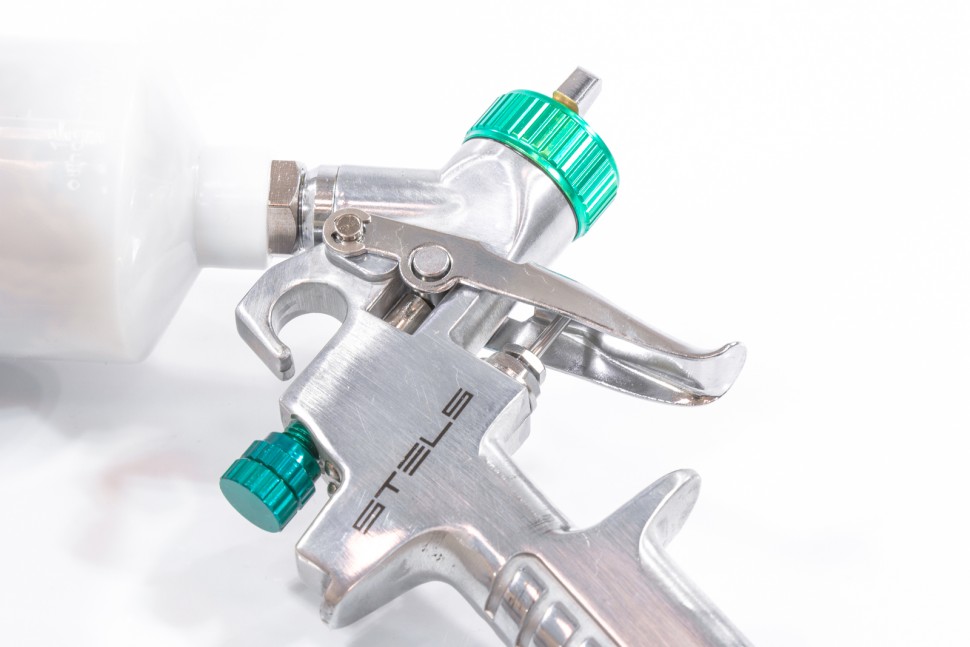 Краскораспылитель с верхним бачком STELS системы HVLP, High Volume Low Pressure (высокий объем, низкое давление).