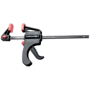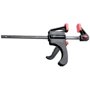 Струбцина изготовлена из ударопрочной пластмассы. Направляющая стальная. Рабочие губки снабжены накладками для предотвращения повреждений обрабатываемых предметов. Опорная губка перемещается и фиксируется по всей длине направляющей при помощи ручки, а также может переставляться на другой конец направляющей, что позволяет использовать струбцину «на разжим».