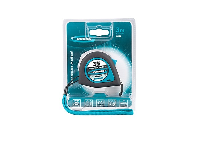 Рулетка Ergonomisch торговой марки GROSS с длиной ленты 3 м. Эргономичный корпус рулетки выполнен из ABS пластика (используется сырье BASF), который сохраняет работоспособность механизма при падении с высоты до 1,5 м. Измерительное полотно рулетки шириной 16 мм обладает высокими упругими свойствами, что позволяет производить измерения в труднодоступных местах. Основание измерительного полотна оснащено обрезиненным магнитным зацепом True Zero (истинный ноль), который обеспечивает фиксацию не только на ровных, но и на округлых поверхностях (например, на трубах). Зацеп True Zero позволяет более точно производить замеры от нуля при внешних/внутренних замерах.
