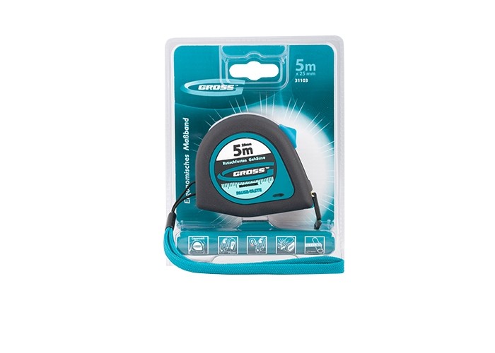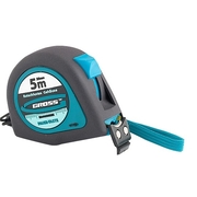 Рулетка Ergonomisch торговой марки GROSS с длиной ленты 5 м. Эргономичный корпус рулетки выполнен из ABS пластика (используется сырье BASF), который сохраняет работоспособность механизма при падении с высоты до 1,5 м. Измерительное полотно рулетки шириной 25 мм обладает высокими упругими свойствами, что позволяет производить измерения в труднодоступных местах. Основание измерительного полотна оснащено обрезиненным магнитным зацепом True Zero (истинный ноль), который обеспечивает фиксацию не только на ровных, но и на округлых поверхностях (например, на трубах). Зацеп True Zero позволяет более точно производить замеры от нуля при внешних/внутренних замерах.