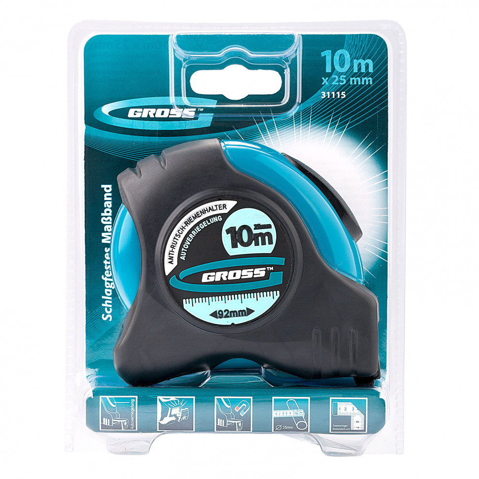 Рулетка "Schlagfest",10 м x 25 мм, магн. обрез зацеп, двухст. шкала, автоматич. фиксация Gross