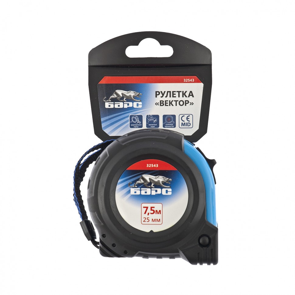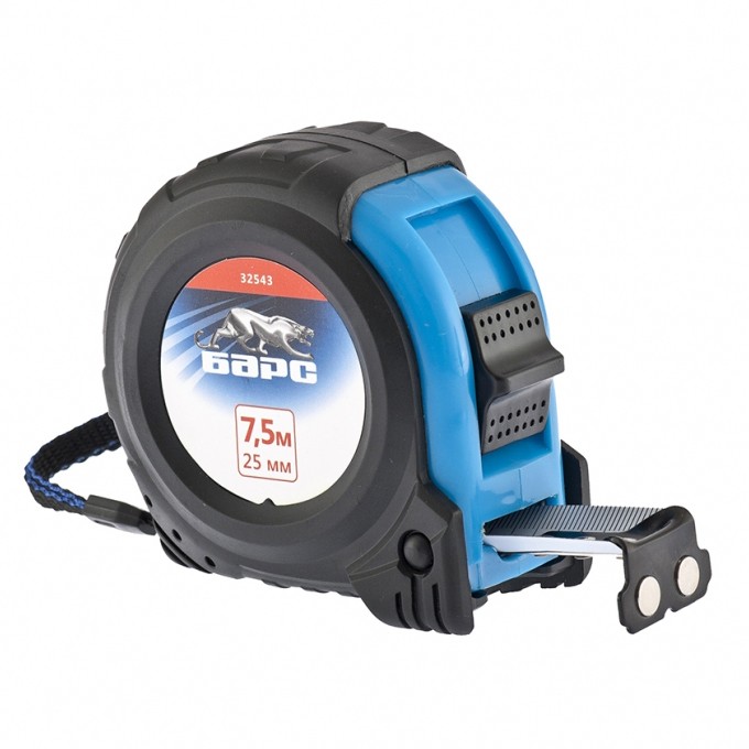 Рулетка Вектор 7,5 м х 25 мм, утолщенное полотно, магнитный зацеп, обрезиненный корпус Барс
