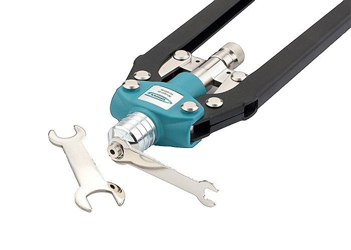 В комплект заклепочника входят сменные насадки для работ стальными, алюминиевыми и нержавеющими заклепками диаметра 3,2 мм, 4,0 мм, 4,8 мм, 6,0 мм, 6,4 мм, а также ключ для их замены.