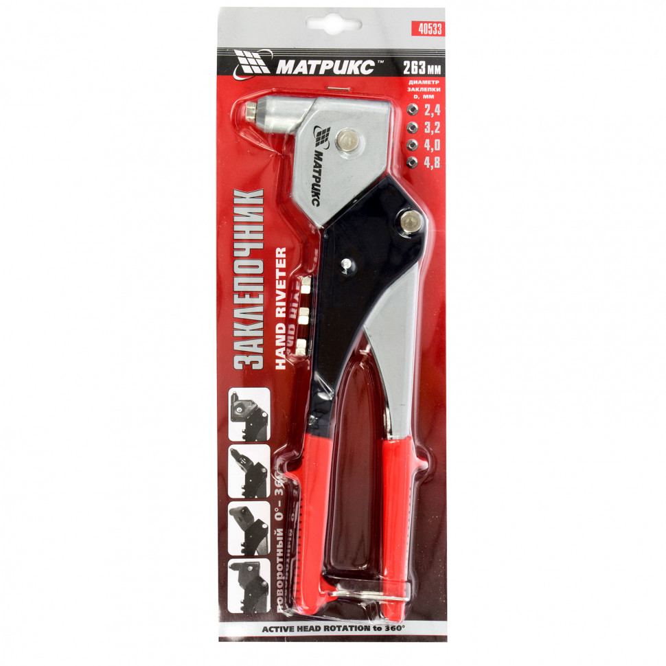 Заклепочник, 263 мм, поворотный 0-360 градусов, заклепки 2,4-3,2-4,0-4,8 мм МАТРИКС