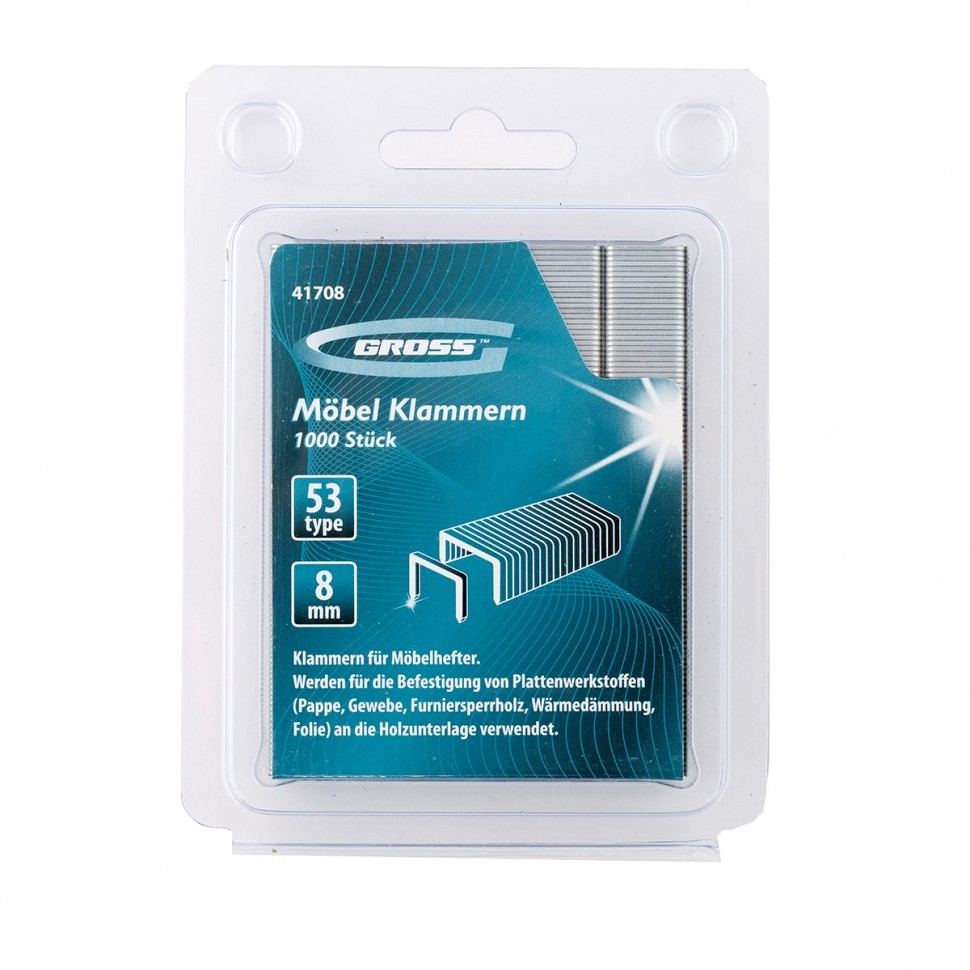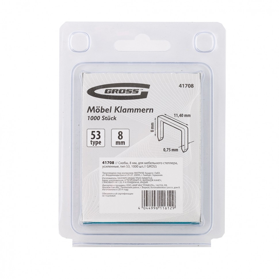Скобы, 8 мм, для мебельного степлера, усиленные, тип 53, 1000 шт. Gross