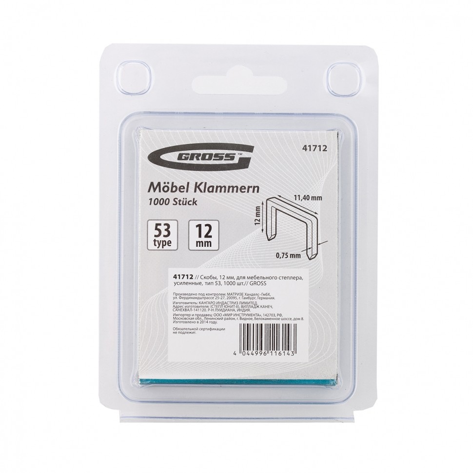 Скобы, 12 мм, для мебельного степлера, усиленные, тип 53, 1000 шт. Gross