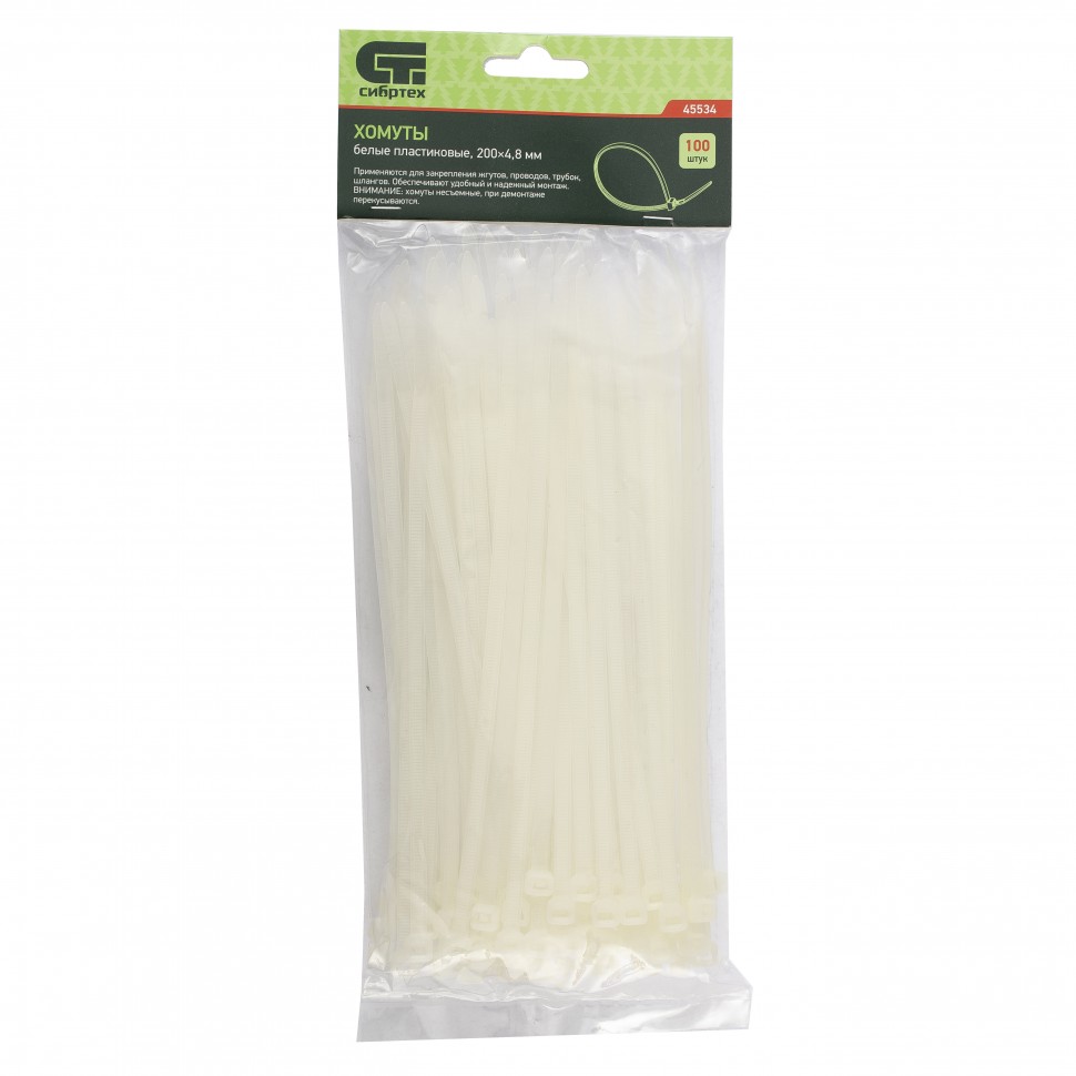 Хомуты, 200 х 4,8 мм, пластиковые, белые, 100 шт. Сибртех