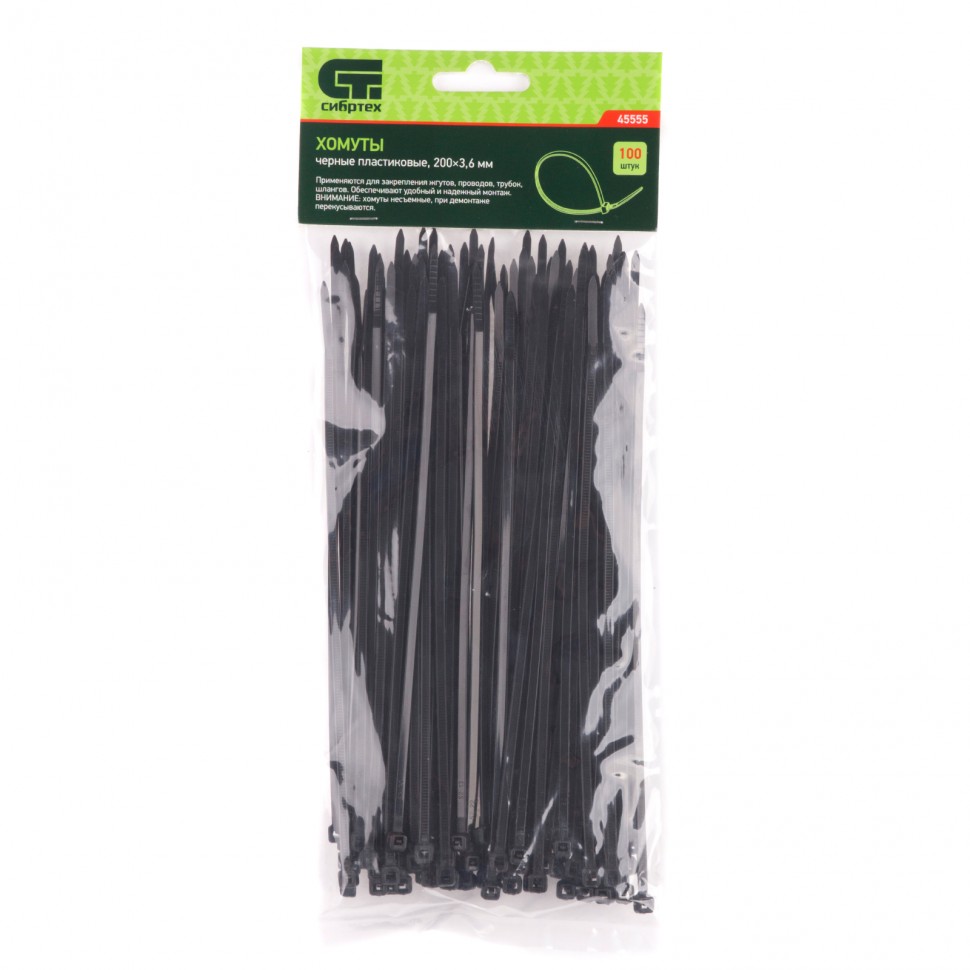 Хомуты, 200 х 3,6 мм, пластиковые, черные, 100 шт. Сибртех