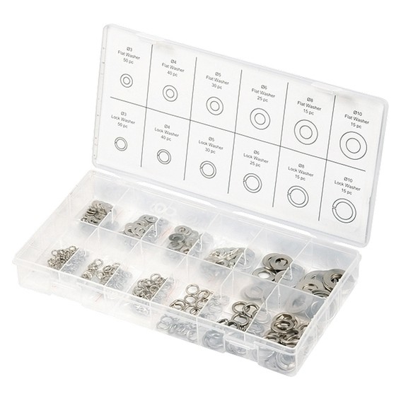 Набор шайб и гроверов наиболее распространенных размеров, упакованные в пластмассовую коробку.