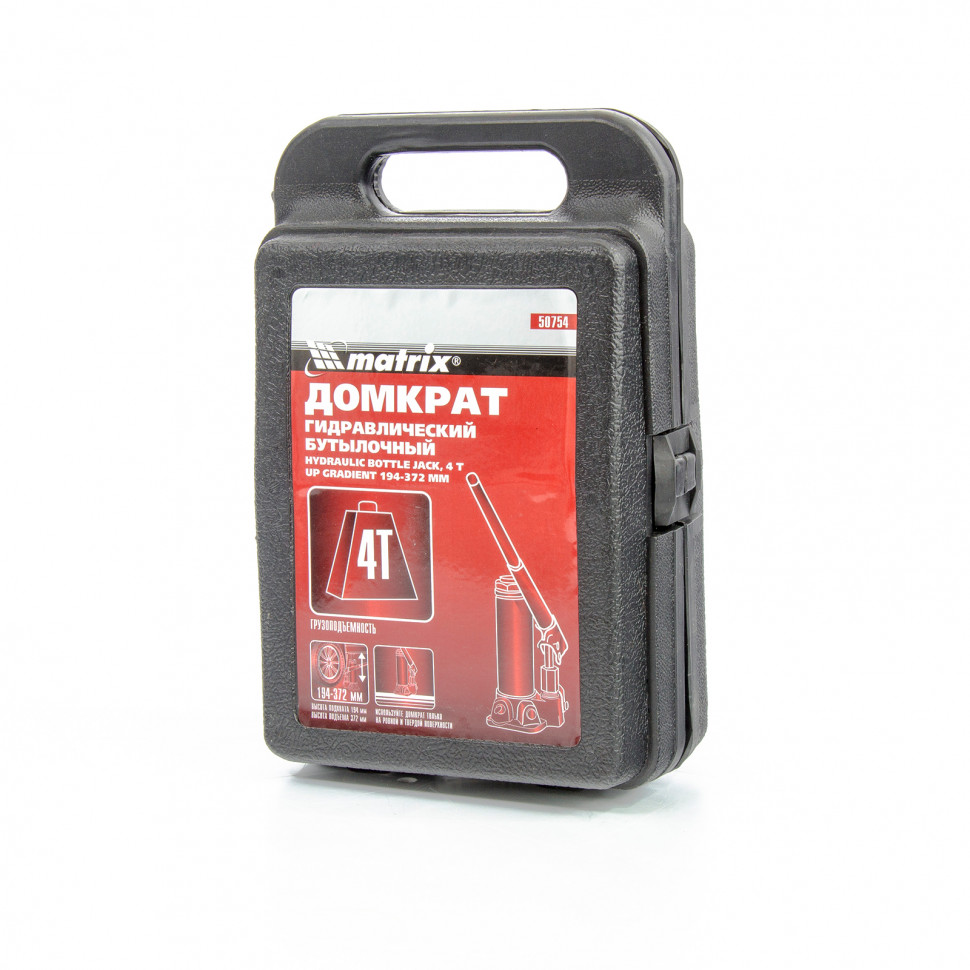 Домкрат гидравлический бутылочный, 4 т, h подъема 194–372 мм, в пласт. кейсе Matrix