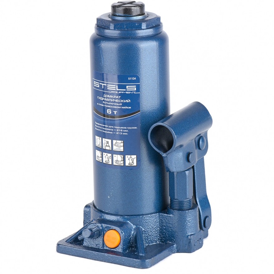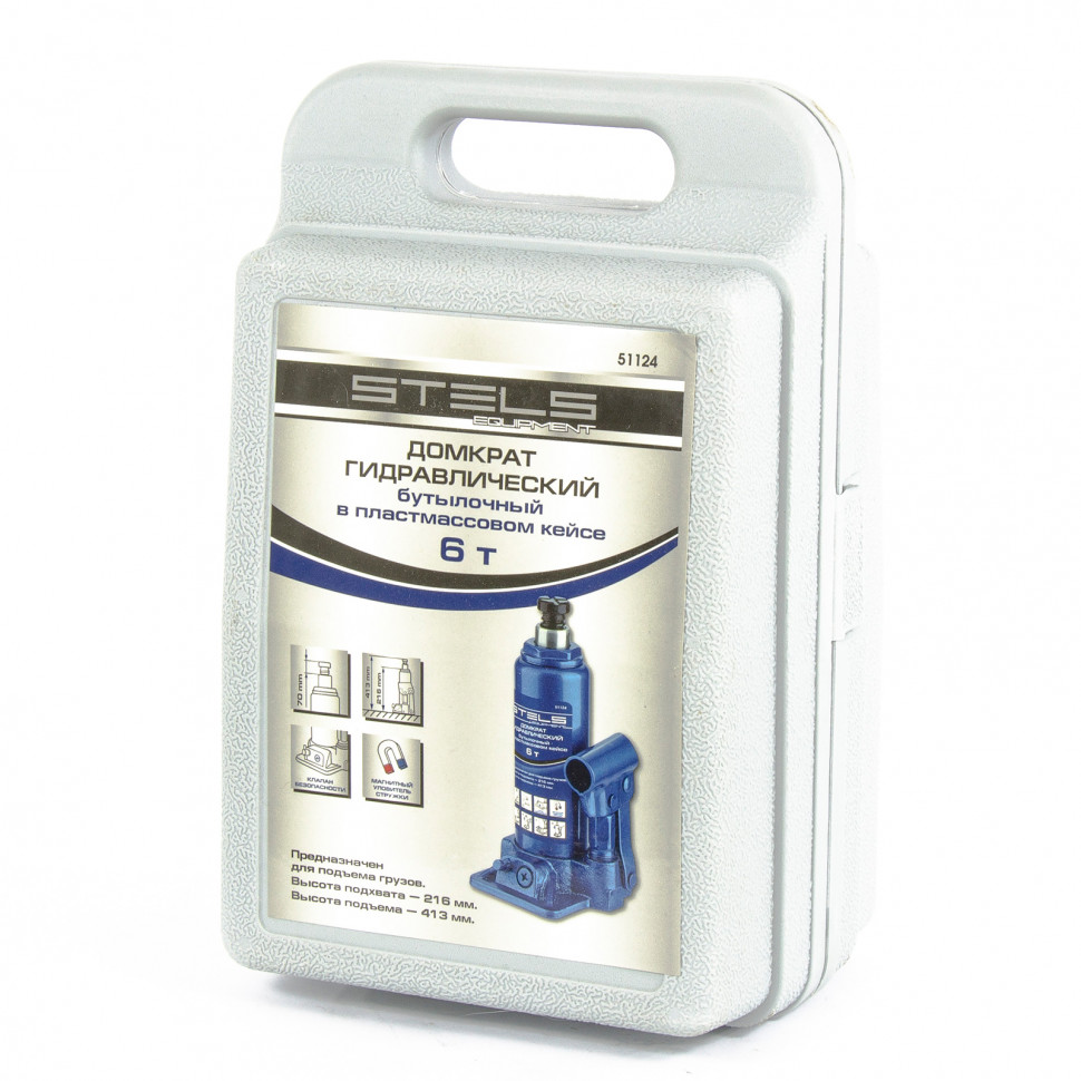 Домкрат гидравлический бутылочный, 6 т, h подъема 216–413 мм, в пласт. кейсе Stels