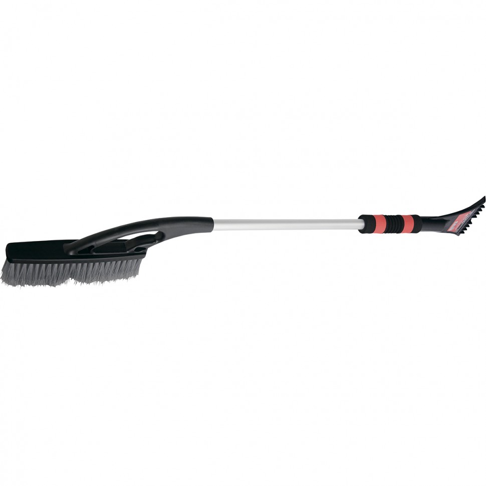 Усиленная рукоятка из алюминиевого сплавас удлиненным мягким держателем. Густая распушеннаящетина для бережной очистки снега с поверхности.Мощный скребок с зубьями для дробления льда.