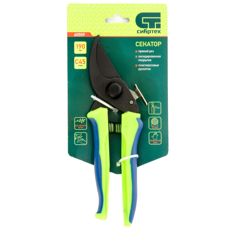 Секатор с прямым резом, пластмассовыми рукоятками и боковым фиксатором. Предназначен для выполнения работ по уходу за садом. Рекомендуется для обрезки живых веток диаметром до 12 мм. Секатор изготовлен из стали 40Х и имеет оксидированное покрытие для защиты от коррозии. Режущее лезвие остро заточено.