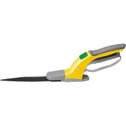 Ножницы газонные с эргономичными рукоятками, поворотной рабочей частью и расположенным сверху фиксатором.