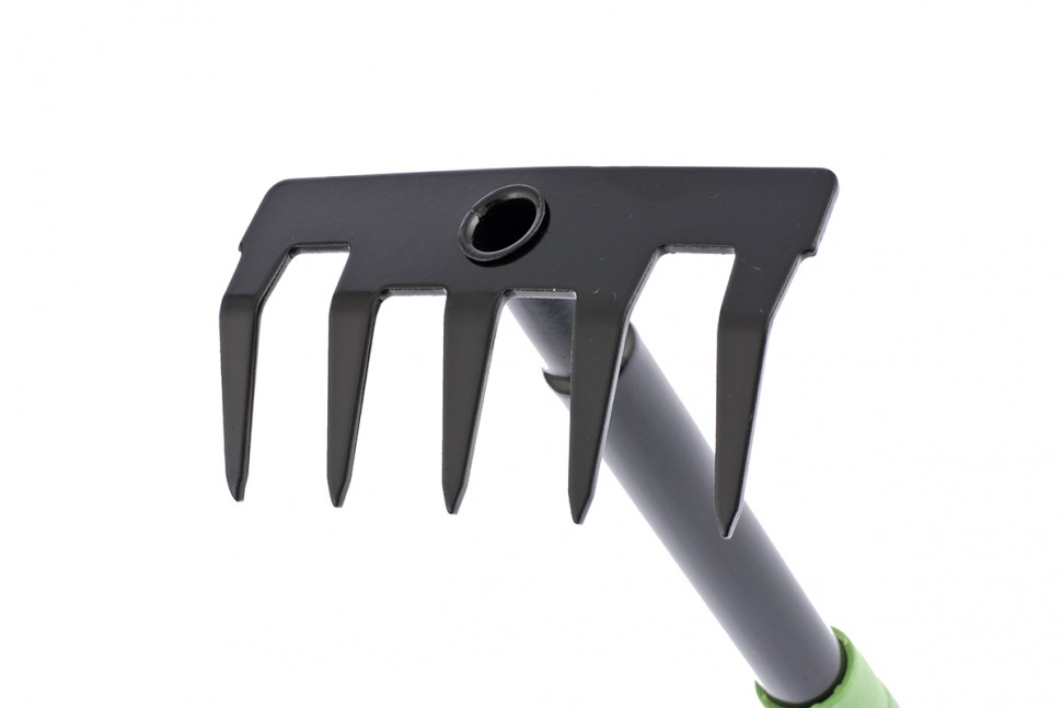 Грабли 5-зубые для сбора срезанных побегов и рыхления почвы на небольших грядках и клумбах, ширина рабочей части 120 мм, общая длина 300 мм.