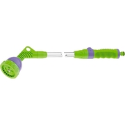 Оснащен регулируемой форсункой, что обеспечивает девять режимов полива: плоско-вертикальную струю, струю под углом, душ, плоско-горизонтальную струю, конусное распыление, центральное распыление, жесткую струю, туман, сочащийся режим.