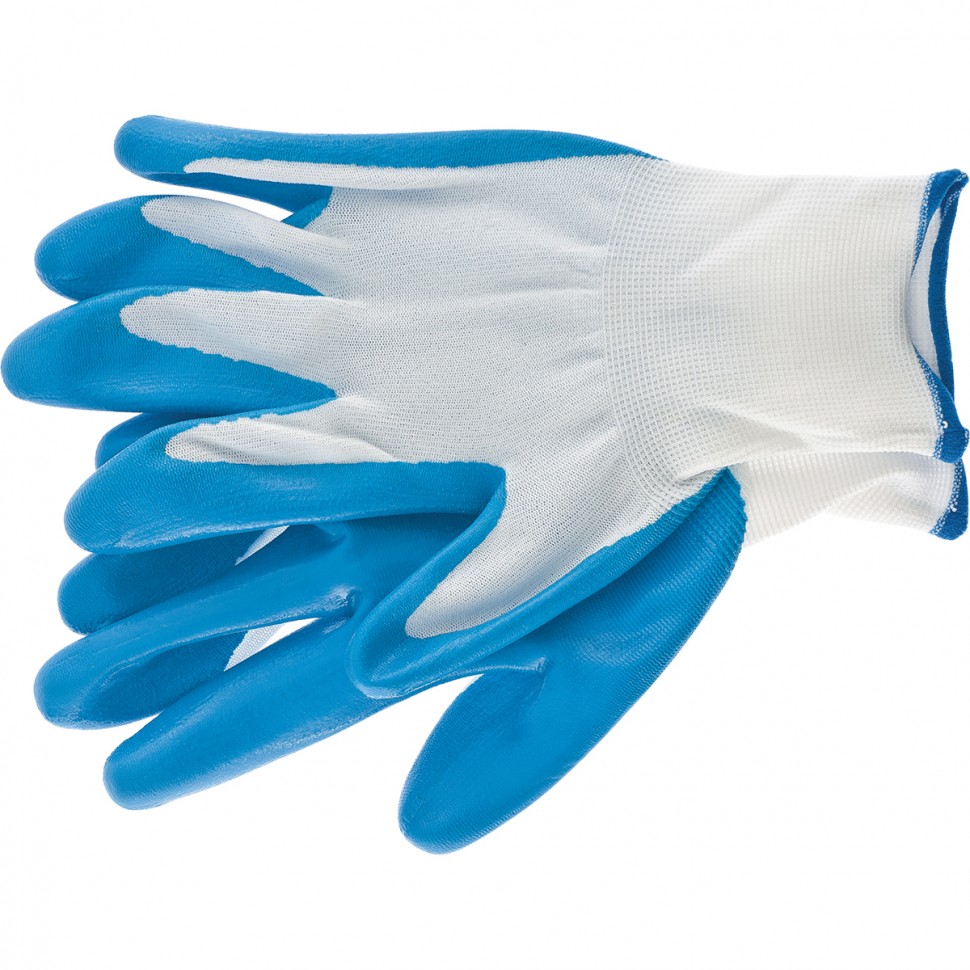 Перчатки полиэфирные с синим нитрильным покрытием маслобензостойкие, L, 15 класс вязки Сибртех