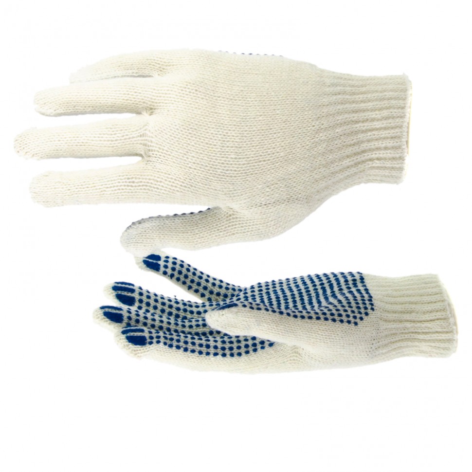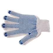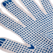 Перчатки трикотажные кругловязаные с ПВХ-нанесением в виде точек и эластичными манжетами.
