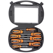 Набор предназначен для монтажа и демонтажа резьбовых соединений. Стержень изготовлен из хромованадиевой стали. Твердость рабочей поверхности – 46 HRC. Наконечник намагничен. Отвертки имеют двухкомпонентную противоскользящую рукоятку эргономичной формы с отверстием для подвески.
