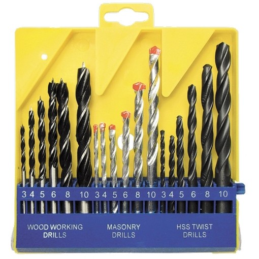 Комбинированный набор с различными типами сверл (по дереву, по металлу и по бетону) наиболее распространенных размеров.