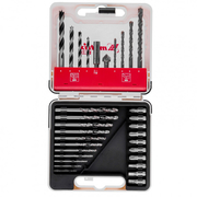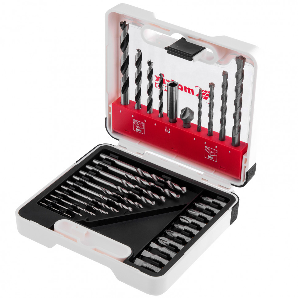 В набор входят высококачественные сверла по бетону, металлу, бетону, камню, дереву и пластику, отверточные биты наиболее распространенных размеров.