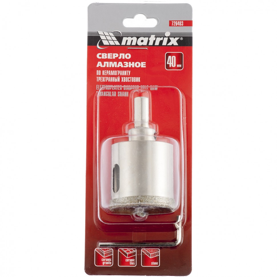 Сверло алмазное по керамограниту, 40 х 67 мм, 3-гранный хвостовик Matrix