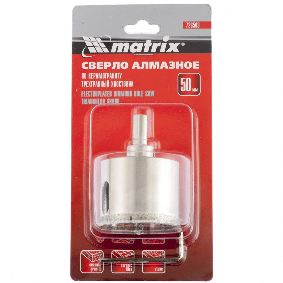 Сверло предназначено для сверления керамогранита, стекла и керамической плитки, обеспечивает точное и чистое отверстие без сколов.