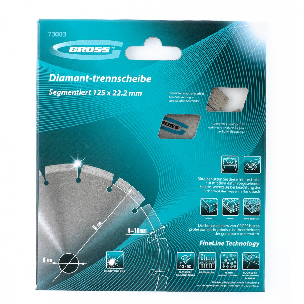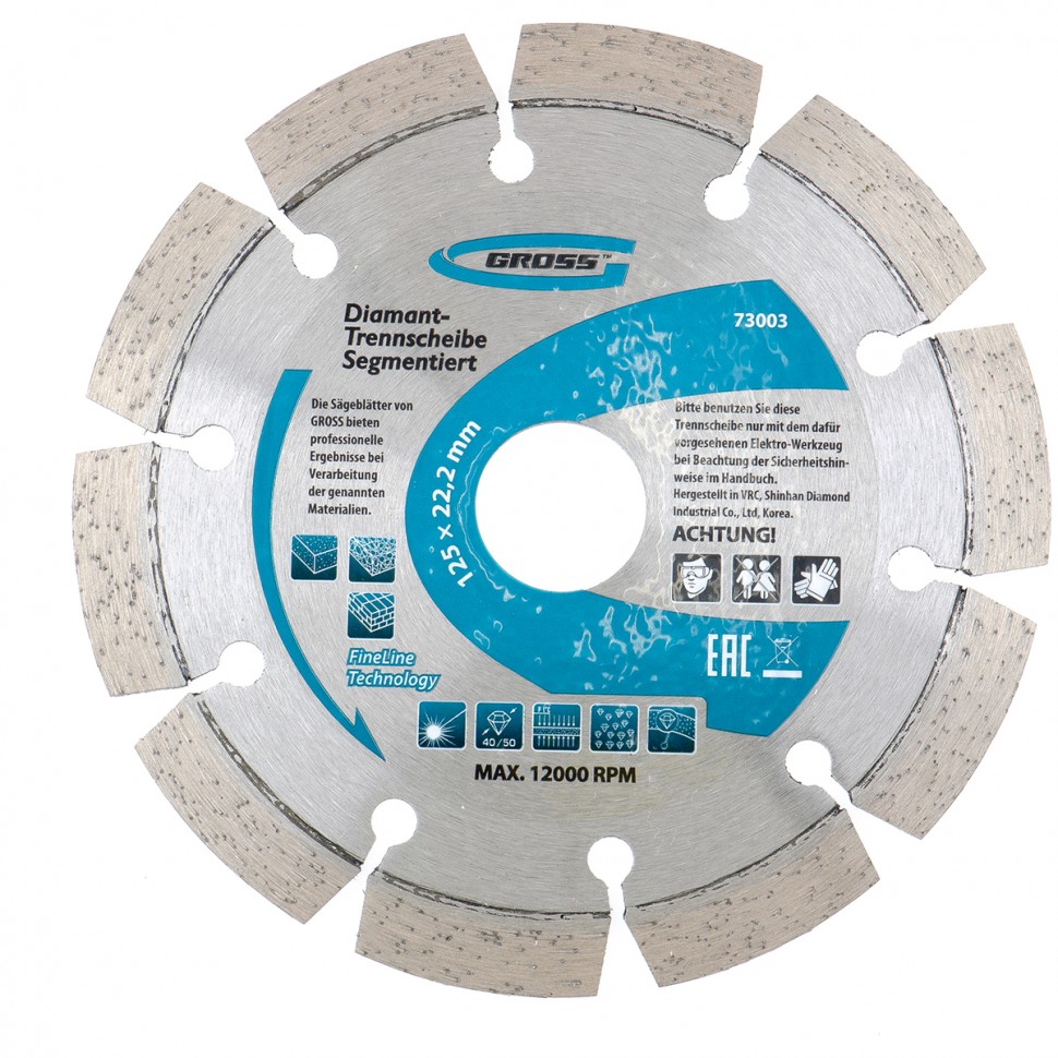 Алмазный диск размером 125 х 22,2 мм торговой марки GROSS предназначен для резки «сухим методом» (без использования охлаждающей жидкости) изделий из твердых материалов: бетона, мрамора, шлакоблоков и гранита.