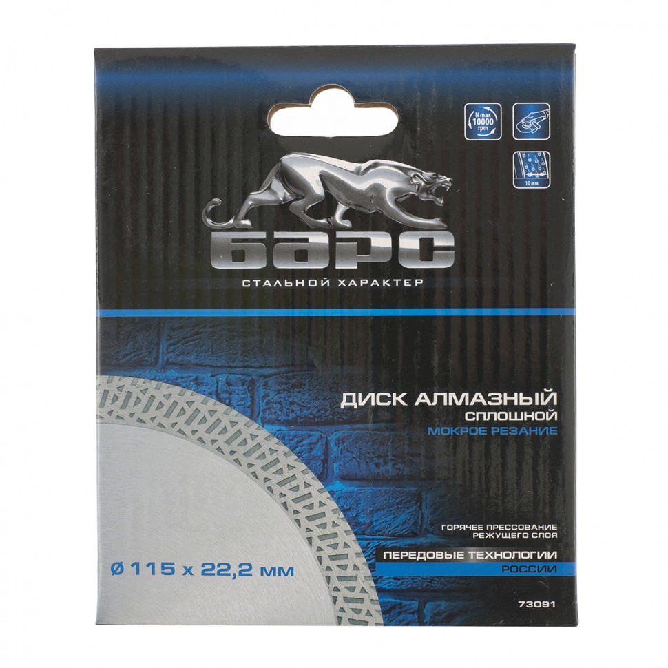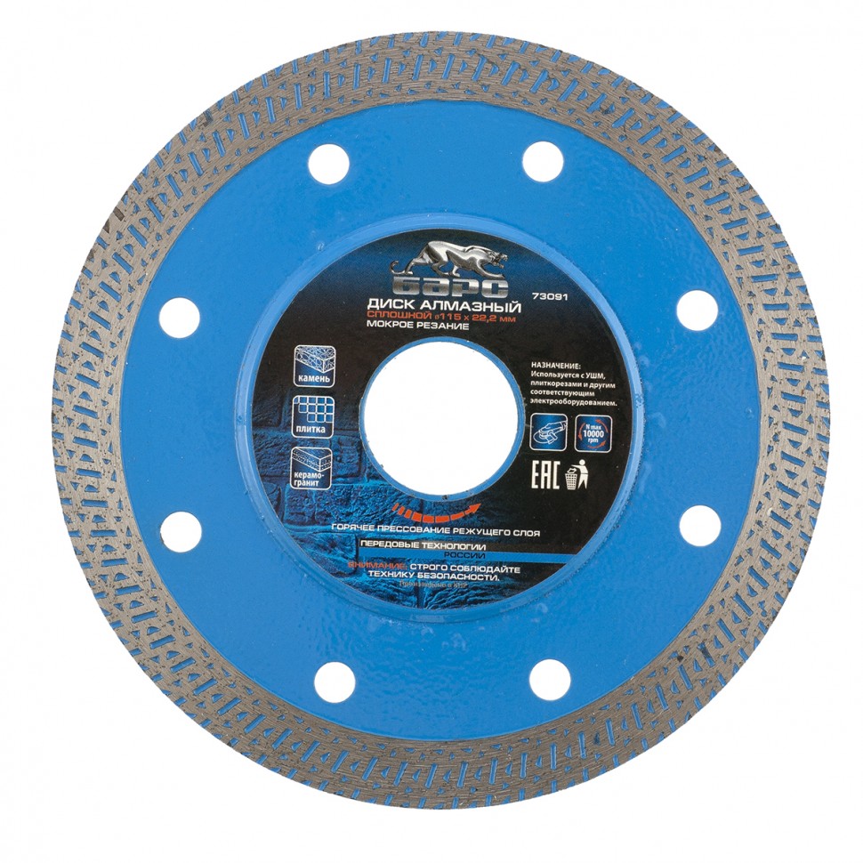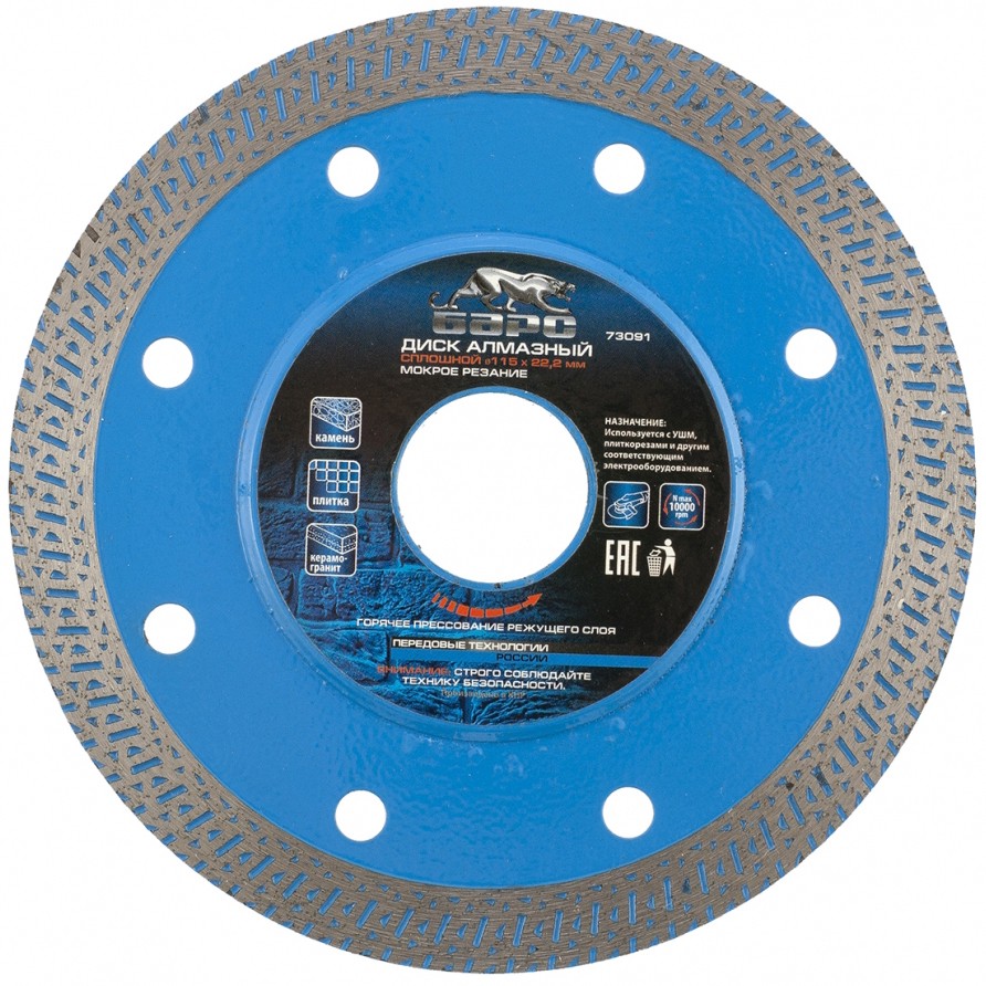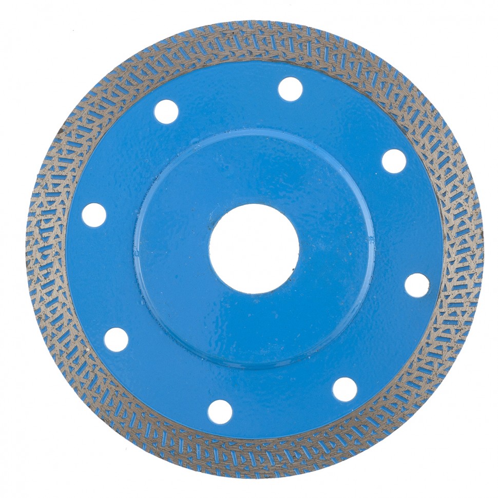 Диск предназначен для сухого и мокрого резания, керамической плитки, керамогранита, природного камня.На основание изстали 65Г, методом горячего прессования, нанесен режущий слой, состоящий из порошков различных металлов и высококачественного синтетического алмаза.Сплошной режущий слой, позволяет получить чистые, ровные края без сколов и трещин.