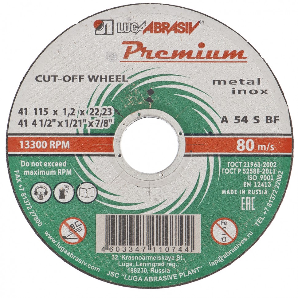 Круг отрезной по металлу+нерж., 115 х 1,0 х 22,2 мм, ПРЕМИУМ (Луга) Россия