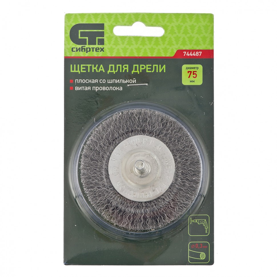 Щетка для дрели, 75 мм, плоская со шпилькой, витая проволока 0,3 мм Сибртех