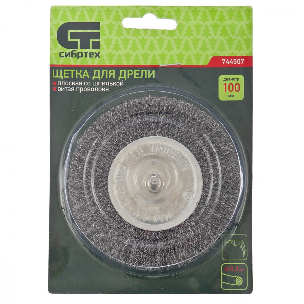 Щетка для дрели 100 мм, плоская со шпилькой, витая проволока 0,3 мм Сибртех