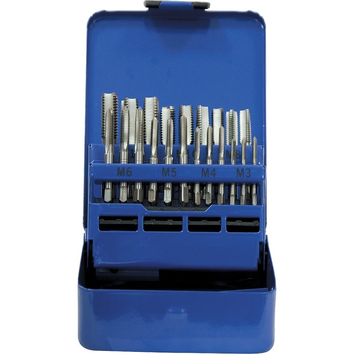 В комплект для нарезания внутренней резьбы входят метчики №1, №2 и №3 размеров М3 х 0,5, М4 х 0,7, М5 х 0,8, М6 х 1,0, М8 х 1,25, М10 х 1,5, М12 х 1,75. Набор упакован в удобную металлическую коробку.