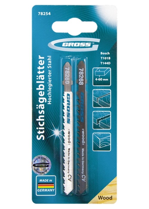 Полотна для электролобзика торговой марки GROSS изготовлены из высококачественной немецкой хромованадиевой стали и относятся к линейке профессионального инструмента. Отличительные особенности этой линейки: стойкость к изнашиванию, более высокая твердость по сравнению с обычными полотнами. При изготовлении полотен применяется лазерный раскрой профиля, процесс заточки и шлифовки полностью автоматизирован. Используются полотна в качестве режущего инструмента для распиловки изделий из твердой и мягкой древесины, фанеры, ламинированного ДВП и пластмассы. Полотно 78260 предназначено для чистого реза, а полотно 78268 — для быстрого реза. Полотна длиной 100 мм с шагом зуба 10 и 6 TPI прекрасно справляется с материалом толщиной от 4 до 60 мм. Набор упакован в жесткую термоформованную пленочную коробку (double blister).