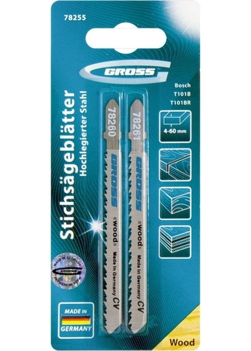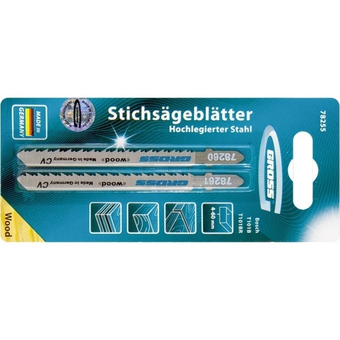 Полотна для электролобзика торговой марки GROSS изготовлены из высококачественной немецкой хромованадиевой стали и относятся к линейке профессионального инструмента. Отличительные особенности этой линейки: стойкость к изнашиванию, более высокая твердость по сравнению с обычными полотнами. При изготовлении полотен применяется лазерный раскрой профиля, процесс заточки и шлифовки полностью автоматизирован. Используются полотна в качестве режущего инструмента для распиловки изделий из твердой и мягкой древесины, фанеры, ламинированного ДВП и пластмассы. Набор содержит 2 полотна: T101B - 75мм х 2,5мм, прямой чистый рез; T101BR - 75мм х 2,5мм, прямой обратный рез.