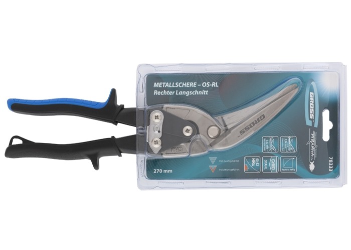 Ножницы по металлу торговой марки GROSS предназначены для проходного прямого и правого реза листового металла толщиной до 1,2 мм и нержавеющей стали толщиной до 0,7 мм. Рабочие части ножниц изготовлены из высоколегированной стали (CrMo), содержание молибдена и ванадия в ее составе придает необходимую жесткость и высокую твердость. Режущие губки проходят процесс индукционной закалки и имеют твердость 60–62 HRС. Ножницы общей длиной 270 мм оснащены эргономичными двухкомпонентными рукоятками, оригинальная форма которых минимизирует риск травм и обеспечивает удобство при длительных работах.