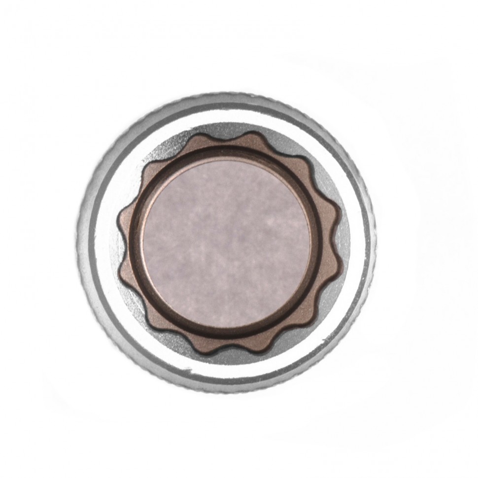 Торцевая головка имеет 12-гранный профиль с увеличенной площадью контакта с деталью, что значительно снижает деформацию граней крепежа при высоких нагрузках и позволяет осуществлять вращение крепежа с меньшим углом поворота (30 градусов) по сравнению с 6-гранным зевом.