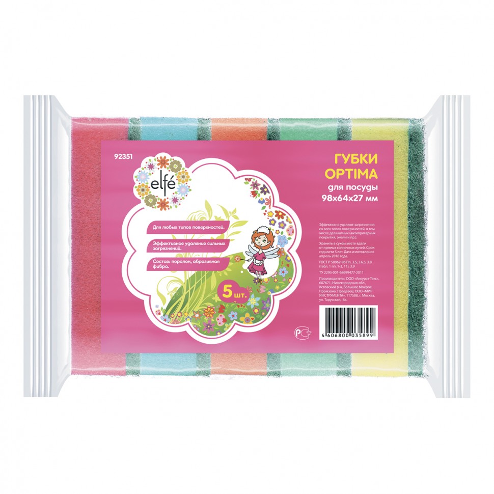 Губки для посуды Optima, 96*64*27 мм, 5шт., Россия Elfe