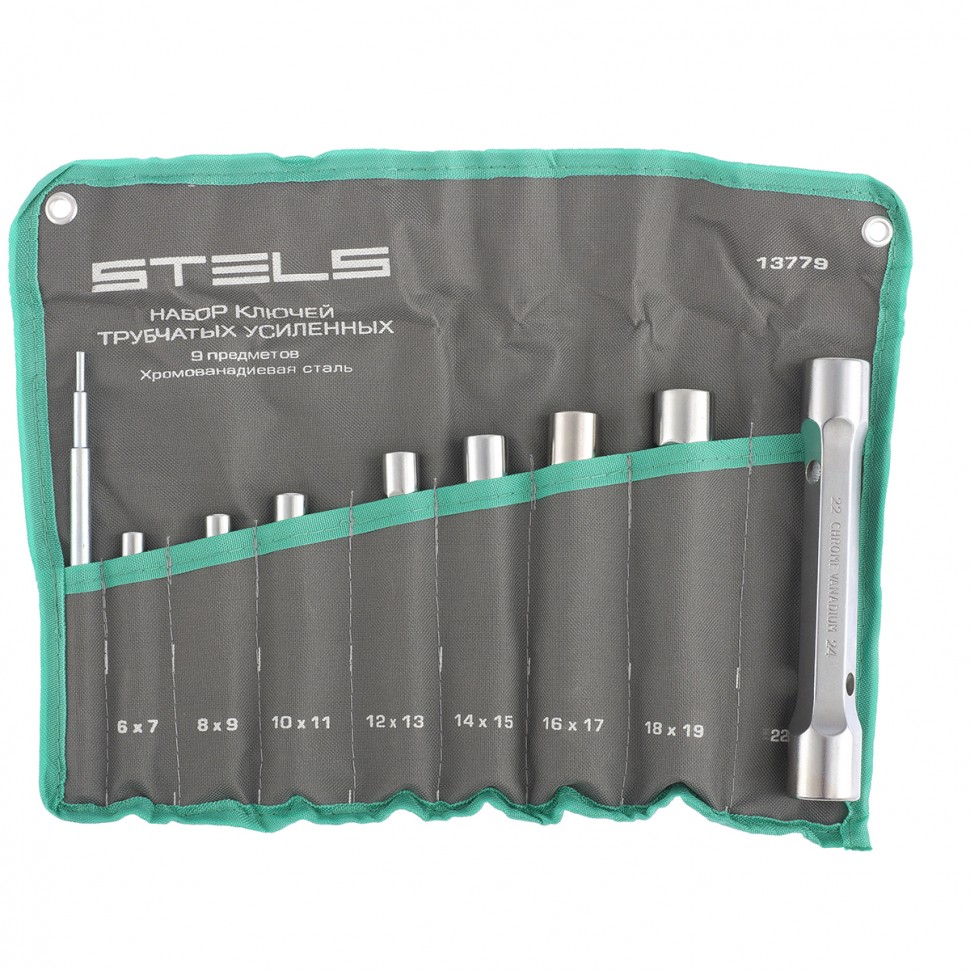 Набор ключей торцевых, двусторонних, усиленных. Используются при монтаже - демонтаже в труднодоступных местах, когда болтовые соединения размещены в значительных углублениях или при демонтаже шпилек. Изготовлены из хромованадиевой стали. Выдерживают значительные усилия по сравнению с обычными трубчатыми ключами. Ключи имеют защитное матовое покрытие. В набор входят: 6х7; 8х9; 10х11; 12х13; 14х15; 16х17; 18х19; 22х24 и вороток. Для удобства переноски в комплекте идет удобная сумка.
